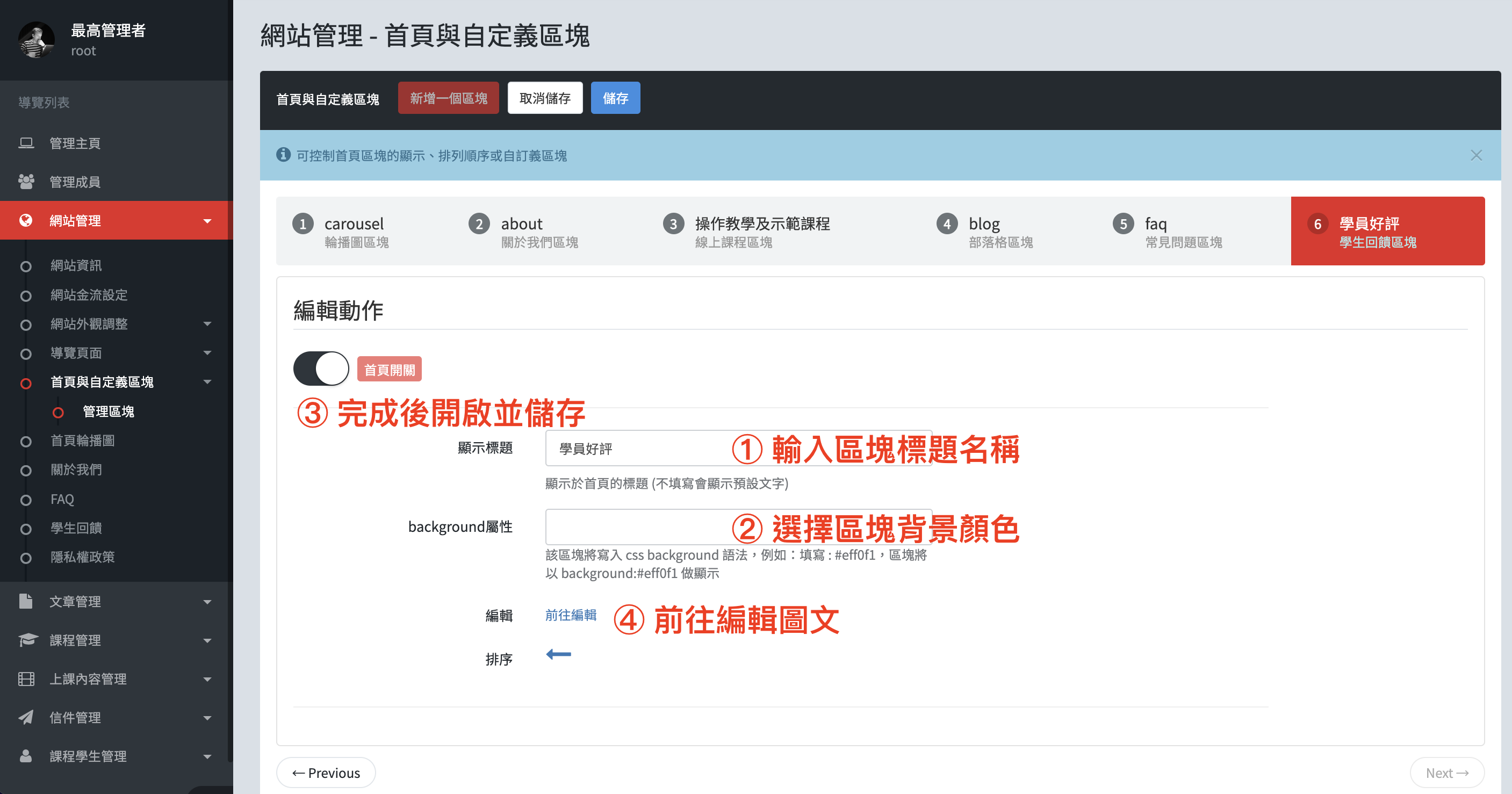 後台『首頁與自訂義區塊』,四步驟完成設定